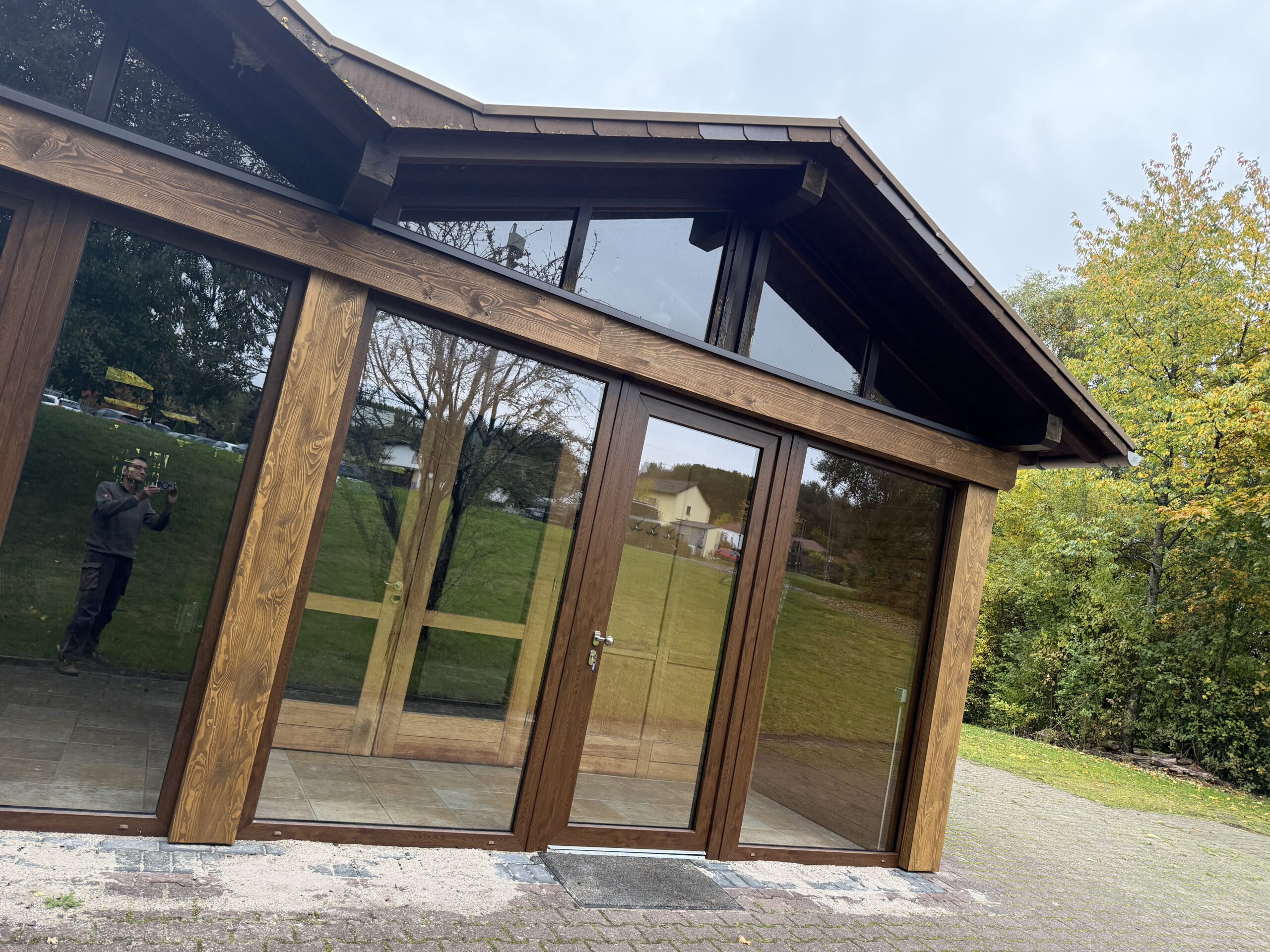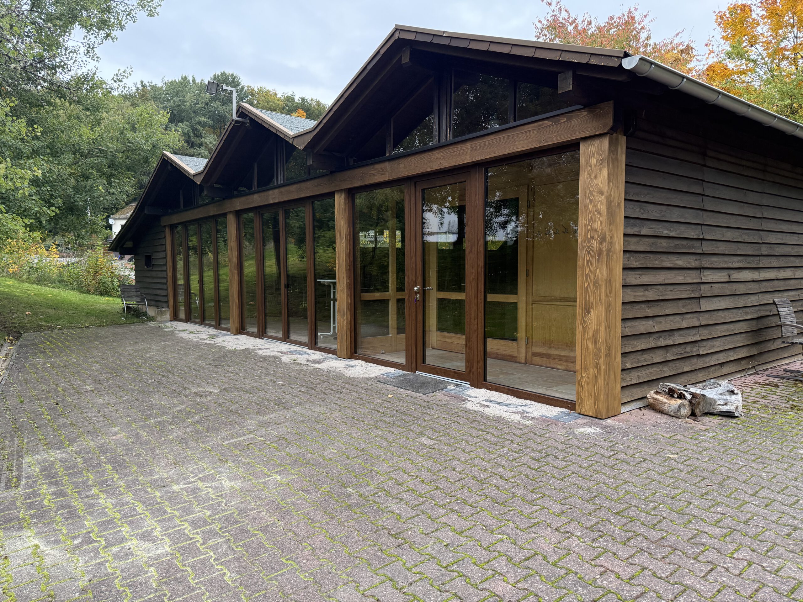 Fensterfront aus Kunststoffelementen, rundum verkleidet mit Massivholzbrettern
